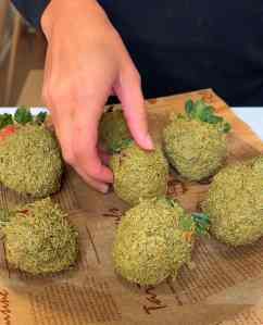 - 4. After about 15-20 minutes, remove from the freezer and wrap the kataifi mix around each strawberry. Then squeeze down on the strawberry to fully coat and pack it down