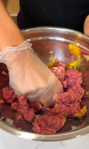Next, add your 80/20 ground beef. Mix together well using kneading like motions. You know it's ready when the meat leaves a film on the side of the bowl