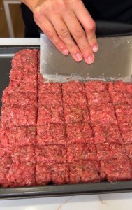 Transfer the seasoned ground beef to a sheet pan and flatten to about 1/2 inch in thickness