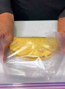 - Roll a good amount of the plantain dough into a ball. Then place on a plastic ziplock bag and cover with another ziplock bag.